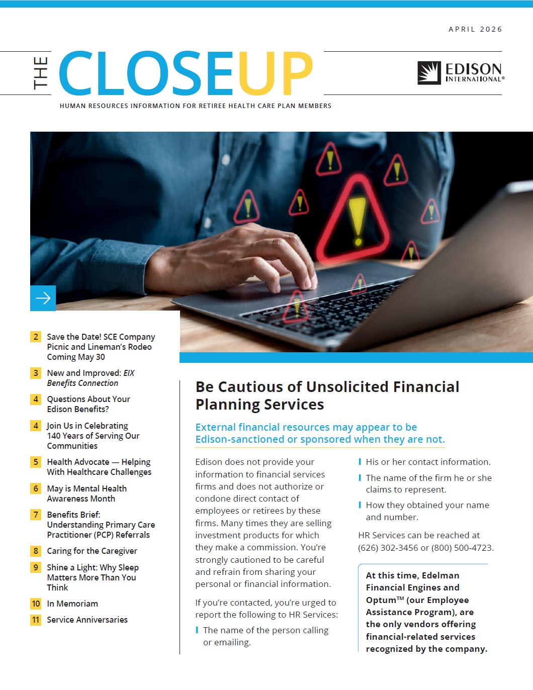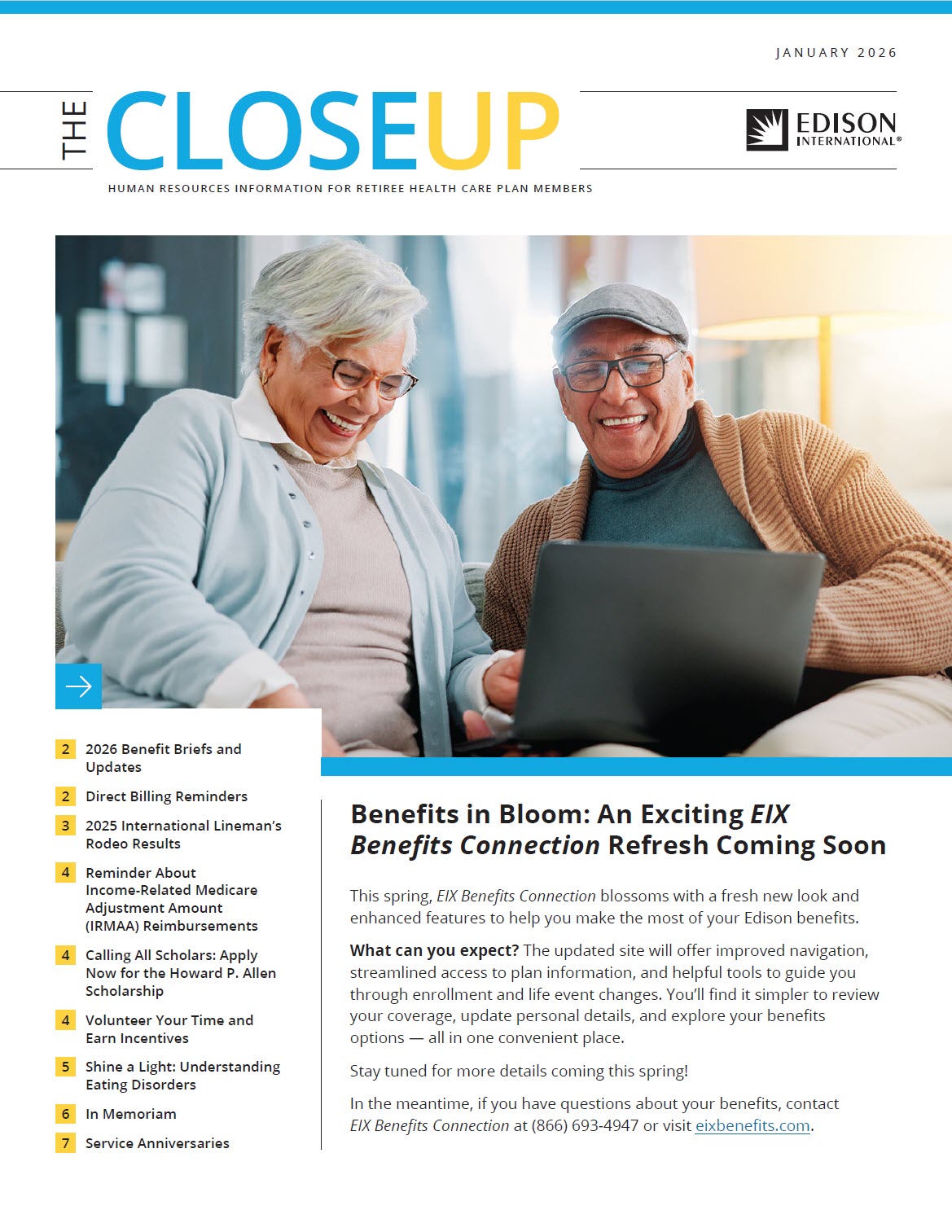 Congratulations to Our 2025 Lineman’s Rodeo and Energy Assistance Fund (EAF) 5K Winners | See Your Way to Better Health with VSP | Edison International’s Latest Sustainability Report | Be Cautious of Unsolicited Financial Planning Services | Volunteer During Edison’s Season of Service | Calm App Now Available at No Cost | Questions About Claims? | Who Pays First? Medicare and Your Edison Retiree Health Care Coverage | Shine a Light on Financial Wellness | In Memoriam |Service Anniversaries